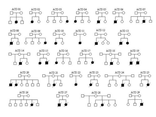 We have collected 29 families, each with one or more infants with ACD in preparation for positional mapping and eventually cloning the ACD gene(s) (see diagram below).