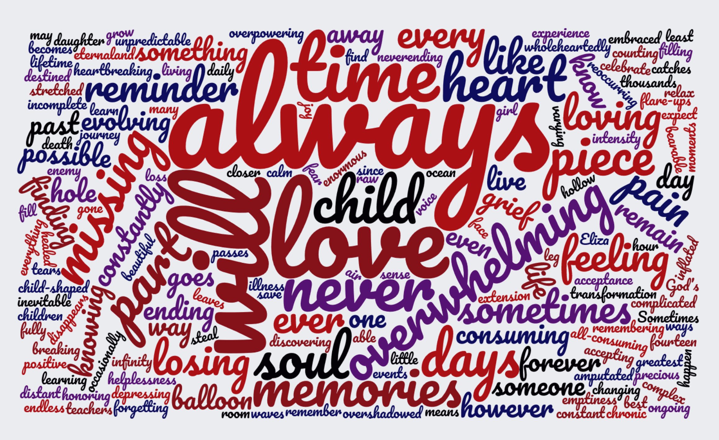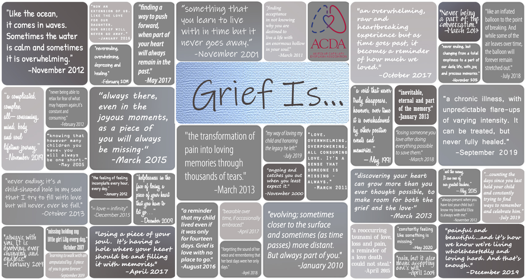 This year we are focusing on grief over time. The purpose of this written word project was to paint a picture of grief at different moments in time as experienced by our ACDA parents, whether it be the profound sadness of the first anniversary of loss or grappling with decades old fears in anticipation of the birth of a first grandchild. While compiling this project, we began to notice a common theme and words that were applied universally by our parents regardless of when their loss had occurred. Words like Always. Love. Child. Will. Time. Never. You can see these prominent words reflected in the word cloud generated from a compilation of the individual quotes above.