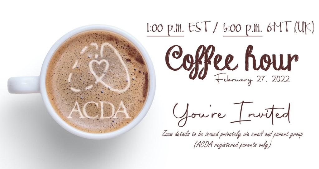 - If you are a parent of a child affected by ACDMPV, please join us for a Coffee Hour on Sunday, February 27, 2022 at 1:00 p.m. EST (6:00 GMT (UK)) to meet and interact with other ACDA registered parents. The Zoom details will be provided separately via email and in a closed group for parents.