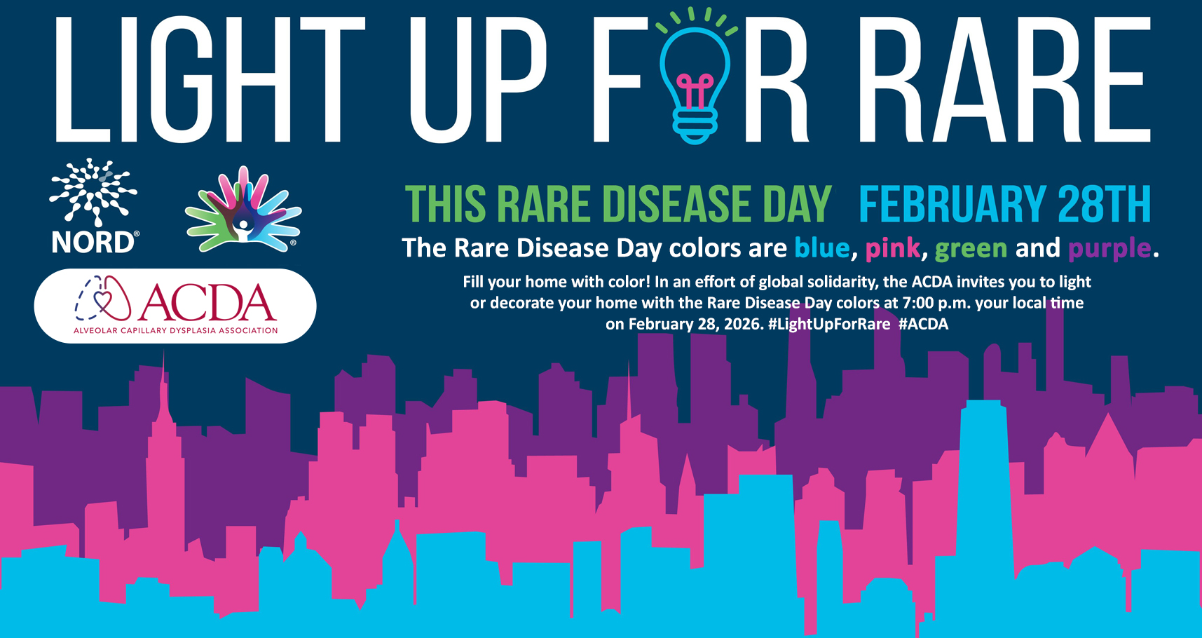 - Fill your home with color! In an effort of global solidarity, you are invited to light or decorate your home with the Rare Disease Day colors at 7:00 p.m. your local time on February 28, 2026. See the flyer below for additional details!