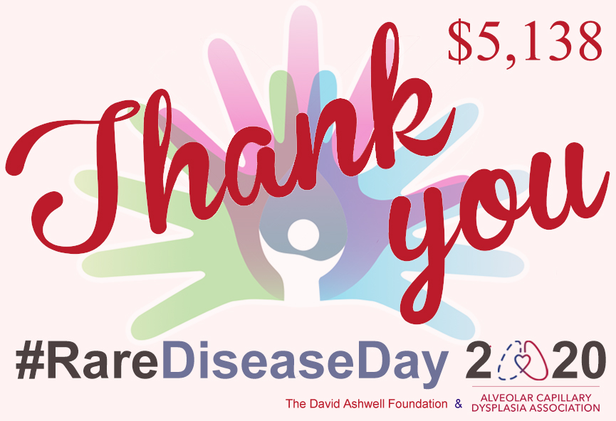 Stay tuned for updates in the coming days on the total amount raised in connection with #RareDiseaseDay 2020! The funds will be contributed to ACDMPV research grants and supports the efforts of the medical community to find the cause of and cure for ACDMPV. If you would still like to contribute, please visit our website here at any time – https://acdassociation.org/donate/