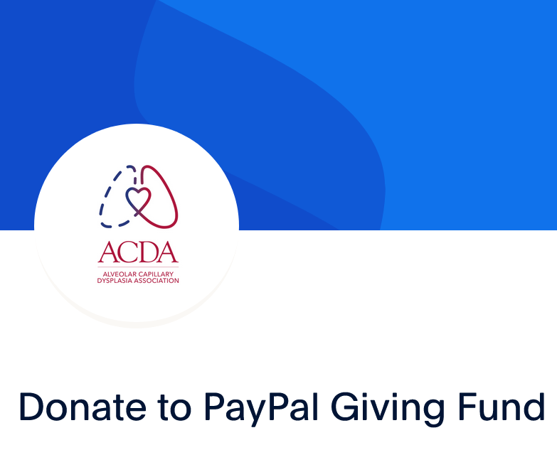 Tax-deductible donations can also be mailed to the following address, checks payable to the “Alveolar Capillary Dysplasia Association”: