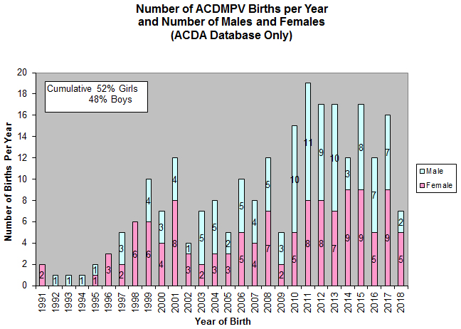 ** Note recurrence numbers do not contemplate a small number of families registered with the ACDA that did not pursue a subsequent pregnancy after genetic testing from the initial occurrence of ACDMPV revealed a familial connection.3. Does ACDMPV affect males and females equally? The research papers we have seen indicate that ACDMPV affects males and females equally. As the sample size has grown over the years, the data is converging on the 50/50 ratio. The 2010 data was 57% female and 43% male, 2012 showed 52% female and 48% male and 2015 showed 51% female and 49% male. Current data in January 2019 shows 52% female and 48% male.