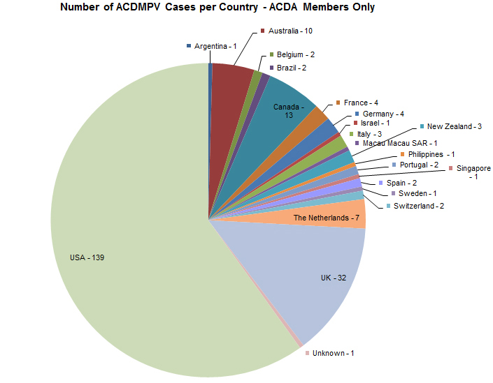 Presumptive prenatal diagnosis without familial history of ACDMPV57. Where do ACDA families live? ACDA families are currently located in 21 countries throughout the world. The largest groups remain the same since the last chart with approximately 60% in the USA, 14% in the UK and 6% in Canada.